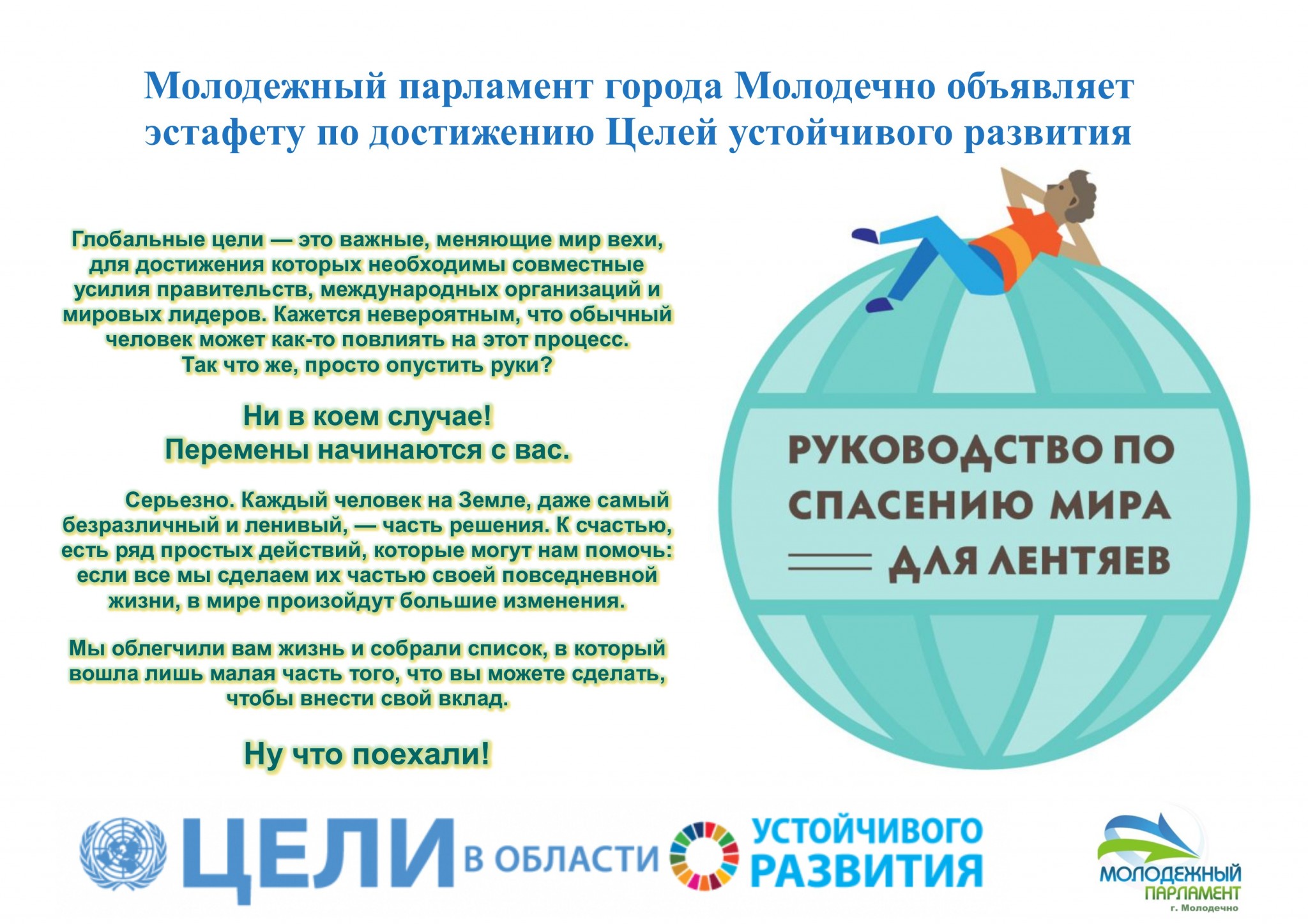 В эстафете принимают участия команды «героев» из числа юных советов, их друзей, родителей и педагогов, которые выполняют определенные действия и делятся ими в социальных сетях. При выполнении конкретного действия участникам необходимо определить и указать достижение какой из целей они приближают. Эстафета разработана на основе «Руководства по спасению мира для лентяев» от ООН и состоит из четырех уровней.